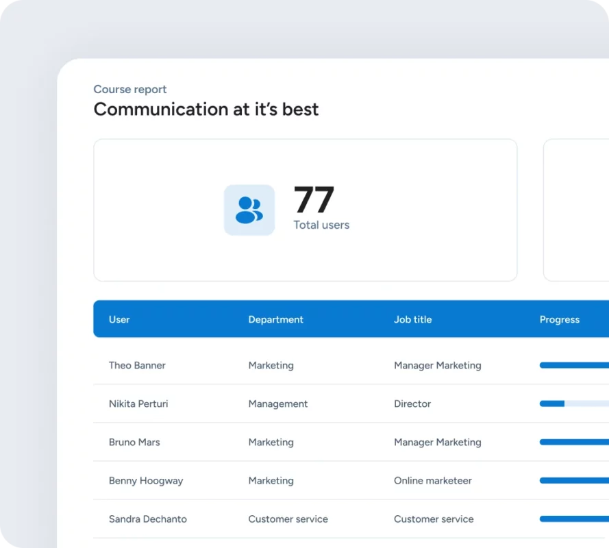 Monitor realtime de voortgang, certificeringen en naleving van je medewerkers. Zo houd je in de gaten hoe je organisatie ervoor staat.